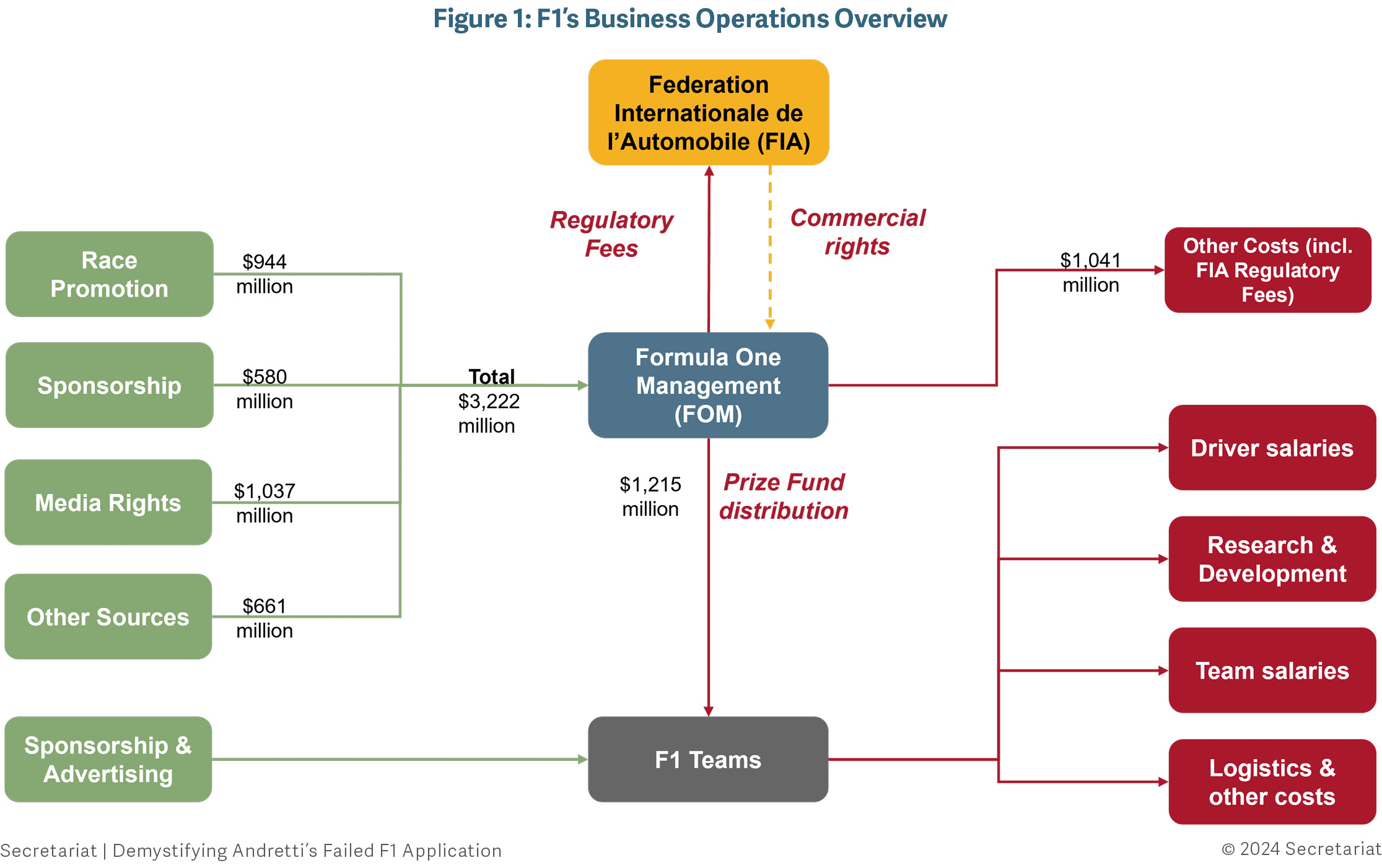 In addition to their share of the prize fund, F1 teams generate revenue from their sponsorship and advertising partners. To compete, F1 teams incur operating costs such as driver salaries, research and development, team salaries, logistics, and other race operation costs.