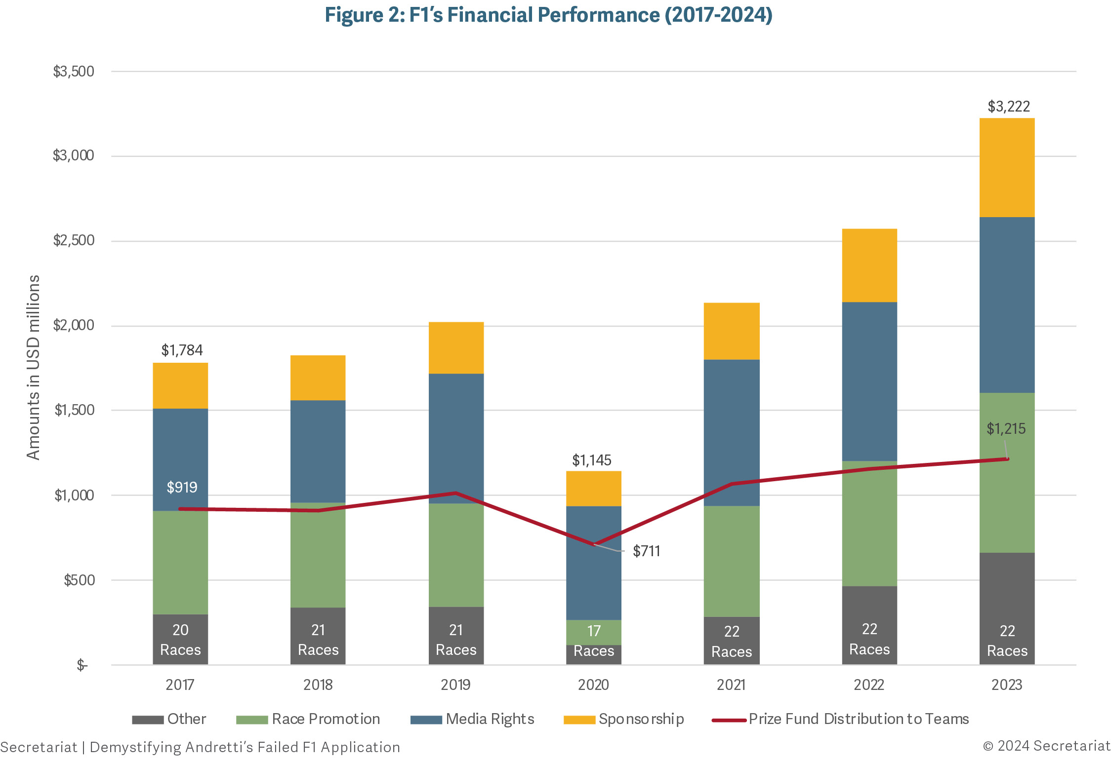 We provide an overview of the F1 business and Andretti’s application. We also discuss how F1’s rise in popularity and financial performance improvements since Liberty Media’s acquisition of the sport mean that Andretti may no longer bring material benefit to F1 on or off the track; and why the current $200 million anti-dilution fee set by the FOM no longer sufficiently covers the dilution in existing teams’ prize fund or reflects the recent transaction prices of F1 teams and may need to be re-looked at. Fees for anti-dilution or expansion are common across American Major Leagues[2] and provide a mechanism to compensate existing teams for their dilution in the share of profits upon the entry of a new team. Therefore, to join the F1 paddock, FOM may need to consider a higher anti-dilution fee that reflects current economic trends to make entry of new teams such as Andretti commercially viable or reject the application process entirely and pursue the standing model, which is to invest in an existing F1 team at prevailing market prices. Our review of these prevailing economic trends helps in demystifying, from a financial perspective, FOM’s decision on Andretti’s application.