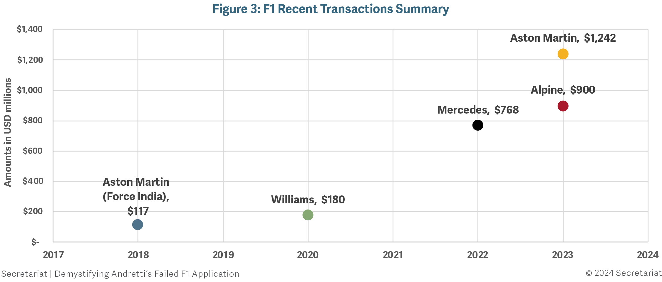 A summary of F1 team implied values based on recent transactions is provided below.